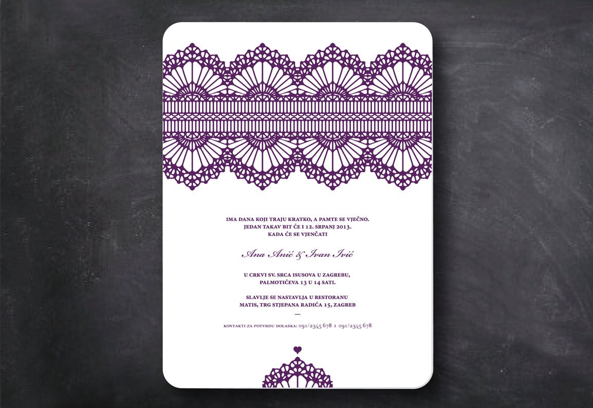 Elegantna i sofisticirana pozivnica za formalnije zabave ili vjenčanja sa uzorkom čipke u tri prekrasne boje - ljubičasta, smeđa i crna...