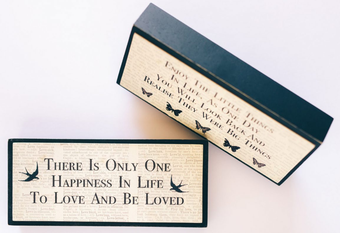 Ovaj samostojeći drveni ukras, dovoljno je malen da nađe svoje mjesto na radnom stolu, ili polici s knjigama, a inspirativni citati podsjetit će vas na ''važne'' stvari u životu. Poklonite ga dragim ljudima, prijateljima za Božić ili rođendan ili mladencima na dan vjenčanja.
