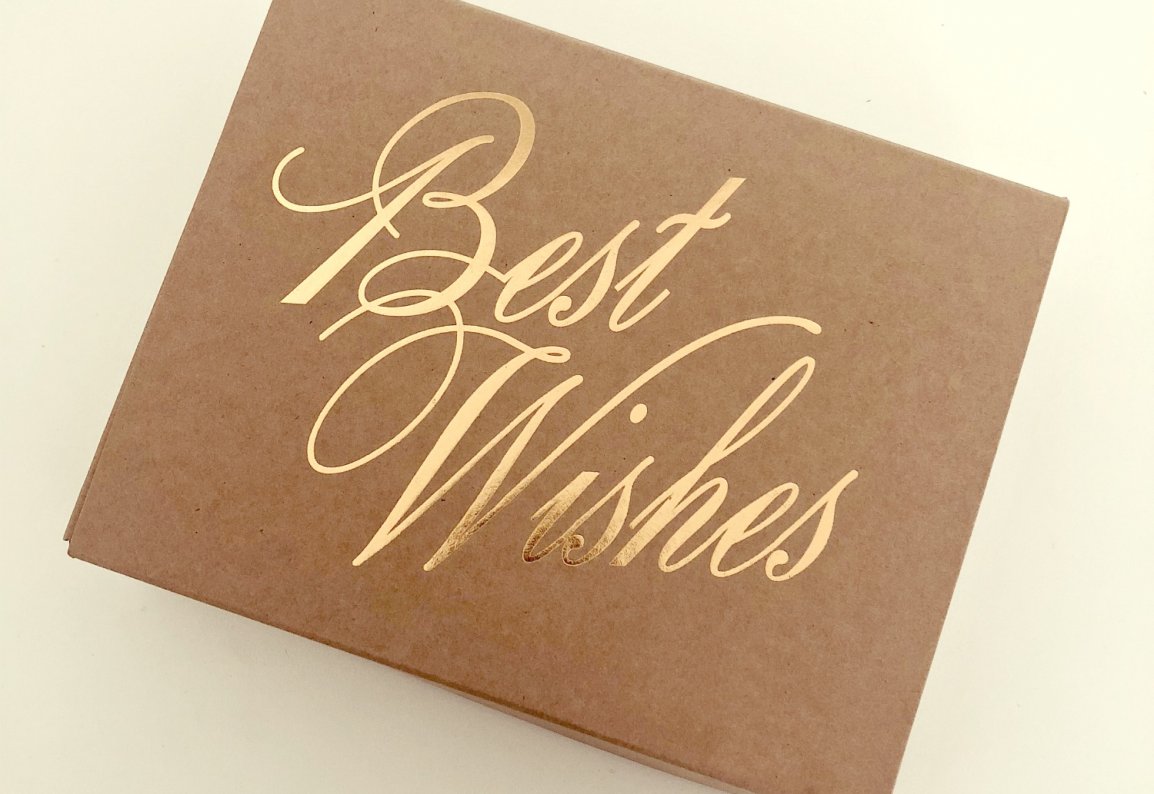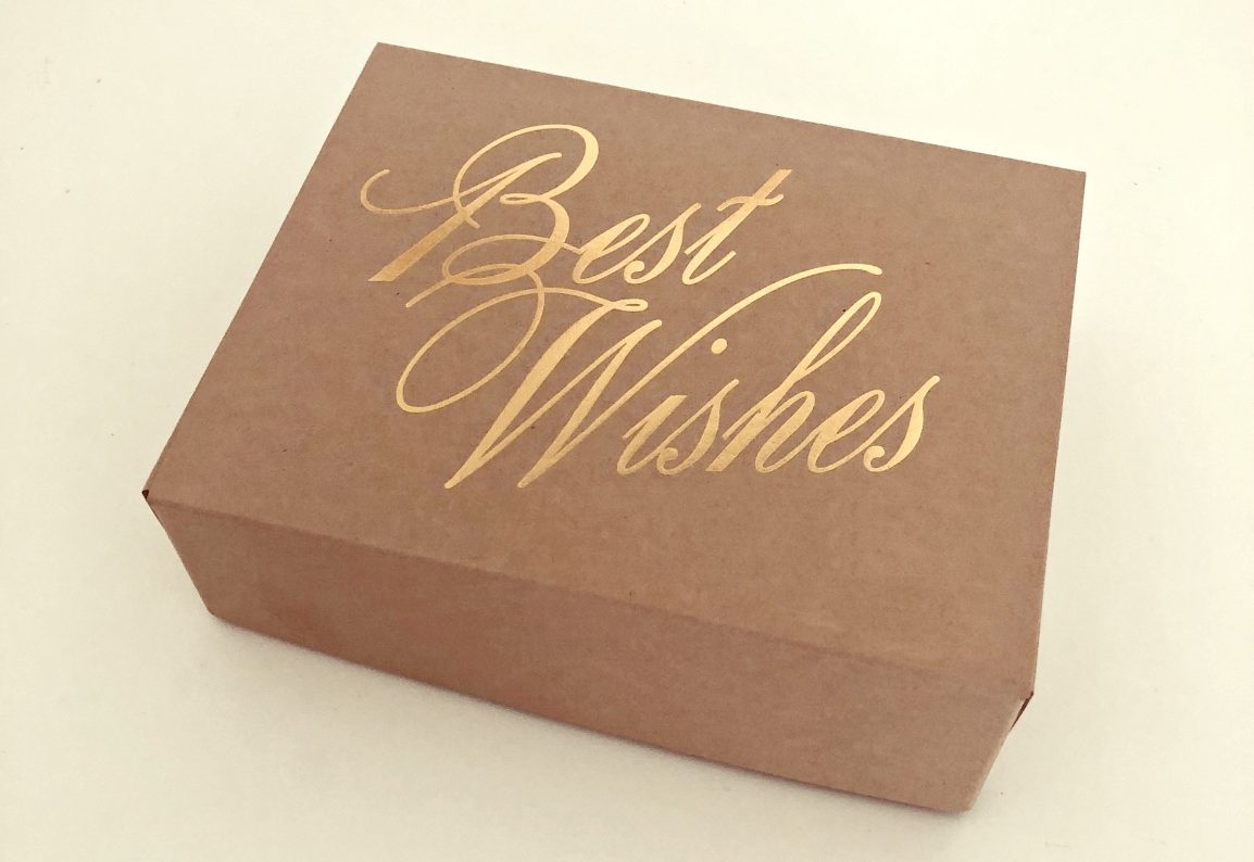 Ova samosloživa kutija idealno je pakiranje za manje poklone. Napravljena je od 350 gramskog kartona, a tekst ''Best Wishes'' otisnut je u zlatnom foliotisku. Dolazi nesložena u paketu od 5 komada. Za slaganje kutije nije potrebno ljepljenje. Cijena uključuje pet praznih kutija.