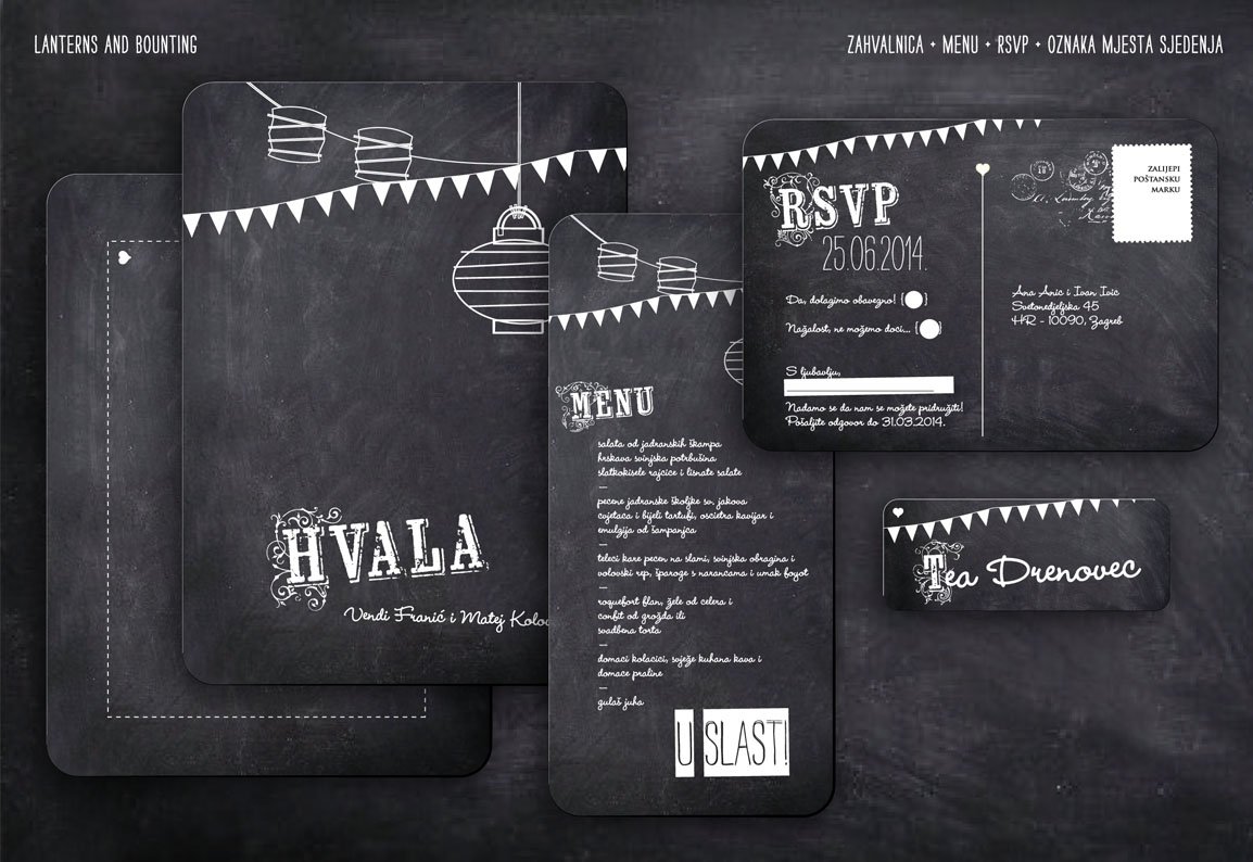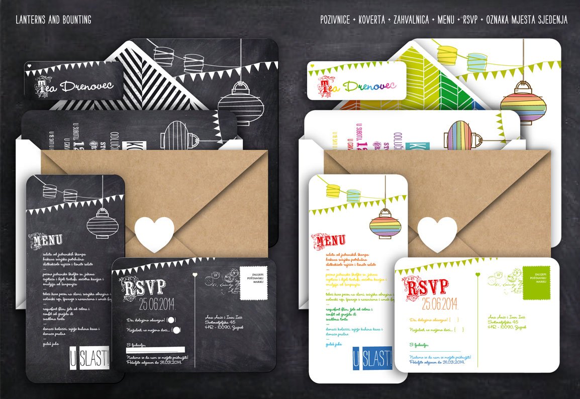 Ova moderna pozivnica sa zastavicama i lampionima inspirirana je veselim ljetnim zabavama na otvorenom uz roštilj ili koktele. Dolazi u popularnoj ''chalkboard'' te šarenoj varijanti. Odlična je za manje formalna vjenčanja te za rođendane i proslave za male i velike.