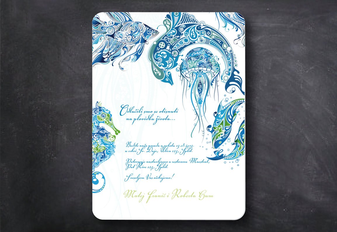 Prekrasne ilustracije morske flore i faune u plavim, tirkiznim i zelenim tonovima.... jednostavno savršena pozivnica za ljetne zabave ili vjenčanja uz more.
